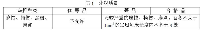 龙骨外形要平整、棱角清晰,切口不允许有毛刺和变形。镀锌层不许有起皮、起瘤、脱落等缺陷。对于腐蚀、损伤、黑斑、麻点等缺陷,按规定方法检测时,应符合表1的要求。